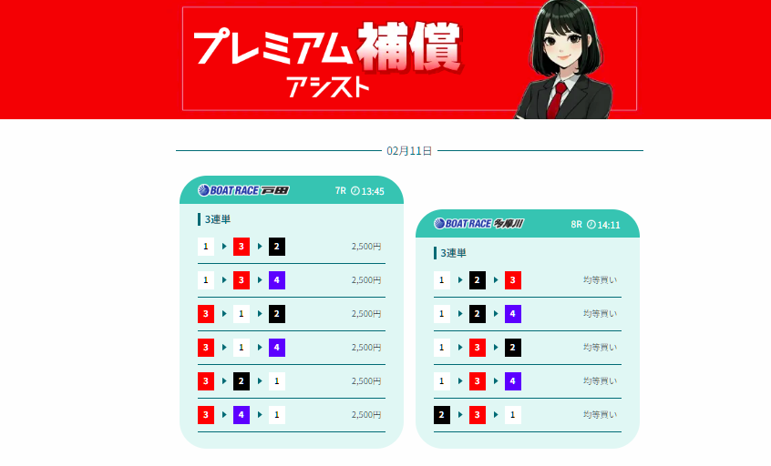 【優良】競艇アシスト 4.31 13 運営会社 競艇アシスト運営事務局 運営責任者 三嶋 拓郎 住所 神奈川県横浜市西区高島2丁目10-13 電話番号 050-8893-6245 電話受付時間 平日10:00~18:00 公式サイトはこちら 総合得点 4.31 13 的中率 4.08 配当額 4.69 信頼度 4.15 クチコミ一覧 13 初回限定プラン 補填付きっていうのがありがたい しかも当たったから別に何の問題もないという 51万8160円になったしこれは十分すぎますわ(^^)/ 続きを読む 閉じる AK 4.67 2026.02.13 このクチコミは参考になりましたか? はい 0 デイナイター当たりました! どっちも当たってナイス配当で+収支になりました! 4万円のお小遣いゲットできてよかったです!! 続きを読む 閉じる AK 4.33 2026.02.08 このクチコミは参考になりましたか? はい 0 昨日も今日も的中 昨日5万3千円当たったんだけど今日も52倍の舟券当てて5万2千円の払い戻しできたよ! この2日で10万円超え獲得は素晴らしいと思う! 続きを読む 閉じる AK 4.67 2026.02.02 このクチコミは参考になりましたか? はい 0 さすがの無料情報 54倍の平和島のレース取れましたよ! 手広く買って押さえてくれたからリスク分散して当てられましたね! ここの予想は自分にあっているようなので次はアドバンスにチャレンジしようかなと…✨ 続きを読む 閉じる AK 4.33 2026.01.09 このクチコミは参考になりましたか? はい 0 初回限定プラン 補償付きでこの内容は満足です! 桐生のコロガシで26万2200円獲得に成功です! アシストの初回限定は迷わず参加してOKです! 続きを読む 閉じる AK 4.33 2026.01.08 このクチコミは参考になりましたか? はい 0 123 クチコミを書く 【優良】競艇アシスト返信をキャンセルする。 ニックネーム任意 的中率必須 星の数をお選びください 配当額必須 星の数をお選びください 信頼度必須 星の数をお選びください クチコミのタイトル必須 クチコミ内容必須 添付ファイル アップロードファイルの最大サイズ: 100 MB。 画像 をアップロードできます。 ここにファイルをドロップ クチコミ投稿の注意点 誤解を生む表現や過激な言い回し、誹謗中傷などはご遠慮ください。最悪の場合、名誉毀損と判断される可能性もございます。なお、すべてのクチコミがサイト上に表示されるとは限りません。競艇リポート運営者の承認後に反映されますので、あらかじめご了承ください。