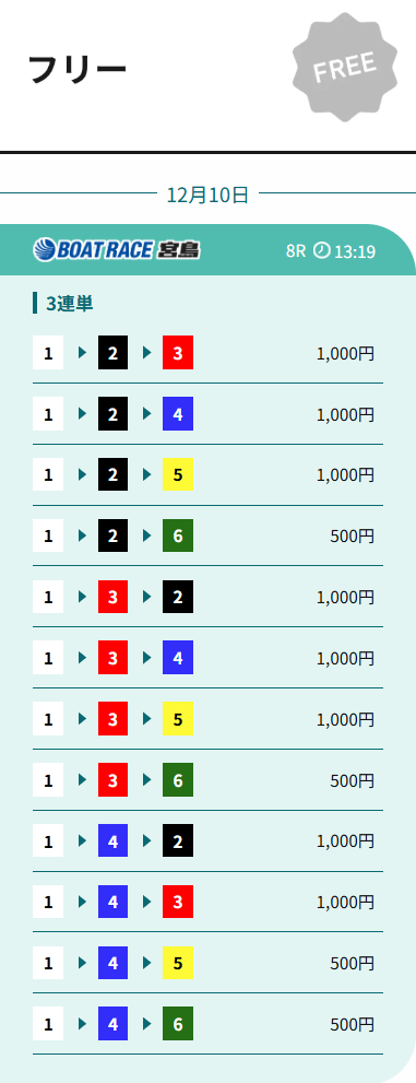 【優良】競艇アシスト 4.27 11 運営会社 競艇アシスト運営事務局 運営責任者 三嶋 拓郎 住所 神奈川県横浜市西区高島2丁目10-13 電話番号 050-8893-6245 電話受付時間 平日10:00~18:00 公式サイトはこちら 総合得点 4.27 11 的中率 4.09 配当額 4.64 信頼度 4.09 クチコミ一覧 11 千円の買い目 当たってよかった~ ほっとしました! 26倍ついたし文句なし文句なし! 続きを読む 閉じる AK 4.00 2025.12.10 このクチコミは参考になりましたか? はい 0 123 クチコミを書く 【優良】競艇アシスト返信をキャンセルする。 ニックネーム任意 的中率必須 星の数をお選びください 配当額必須 星の数をお選びください 信頼度必須 星の数をお選びください クチコミのタイトル必須 クチコミ内容必須 添付ファイル アップロードファイルの最大サイズ: 100 MB。 画像 をアップロードできます。 ここにファイルをドロップ クチコミ投稿の注意点 誤解を生む表現や過激な言い回し、誹謗中傷などはご遠慮ください。最悪の場合、名誉毀損と判断される可能性もございます。なお、すべてのクチコミがサイト上に表示されるとは限りません。競艇リポート運営者の承認後に反映されますので、あらかじめご了承ください。