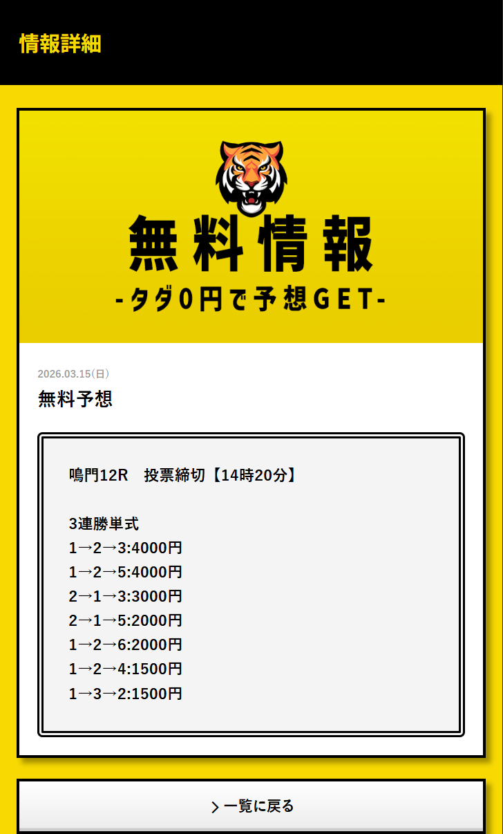 【優良】TIGER BOAT(タイガーボート) 4.12 31 販売業者 TIGER BOAT運営事務局 販売責任者 城島実 所在地 東京都渋谷区渋谷3丁目1番9号 電話番号 05030913217 問い合わせ受付時間 11~17時 問合せ受付メールアドレス service@tiger-boatrace.net タグ 優良 公式サイトはこちら 総合得点 4.12 31 的中率 4.13 配当額 4.10 信頼度 4.13 クチコミ一覧 31 メルマガから参加しました! 即的中いただきました\(^o^)/ 登録してよかった~ 4000円の圧張りの買い目が当たったんで36,800円払戻しできましたよ~(´▽`) デイも参加してる方いたら今日81,600円になってますね( ゚Д゚)うらやましい~ 続きを読む 閉じる AK 4.67 2026.03.15 このクチコミは参考になりましたか? はい 0 タダで当たる 買い目をありがとうございます! 日曜日の昼間に4万4800円もごちそうさまです🐯 続きを読む 閉じる AK 4.33 2026.03.15 このクチコミは参考になりましたか? はい 0 1500円の買い目だけど 39倍当たったからよし◎ 58,500円あざます!! 続きを読む 閉じる AK 4.33 2026.03.07 このクチコミは参考になりましたか? はい 0 続きです からのナイターで一気に13万1600円 桁違いの予想に驚愕です 本当にすごい予想を出すサイトだと思いました…! 続きを読む 閉じる AK 5.00 2026.02.24 このクチコミは参考になりましたか? はい 0 完璧予想あざます!!! まじで神の予想すぎました! 競馬ないから競艇やろうと思ってタイガーボートの予想に乗ってみたら17万円も稼げたのですが(笑) まずはこのデイ予想で4万5千円 続きを読む 閉じる AK 5.00 2026.02.24 このクチコミは参考になりましたか? はい 0 12…7 クチコミを書く 【優良】TIGER BOAT(タイガーボート)返信をキャンセルする。 ニックネーム任意 的中率必須 星の数をお選びください 配当額必須 星の数をお選びください 信頼度必須 星の数をお選びください クチコミのタイトル必須 クチコミ内容必須 添付ファイル アップロードファイルの最大サイズ: 100 MB。 画像 をアップロードできます。 ここにファイルをドロップ クチコミ投稿の注意点 誤解を生む表現や過激な言い回し、誹謗中傷などはご遠慮ください。最悪の場合、名誉毀損と判断される可能性もございます。なお、すべてのクチコミがサイト上に表示されるとは限りません。競艇リポート運営者の承認後に反映されますので、あらかじめご了承ください。